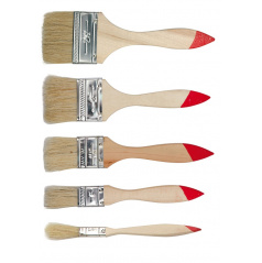 Sada pěti plochých štětců anglického typu. Štětiny orámované kovovou objímkou ??na dřevěné lakované rukojeti.