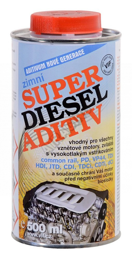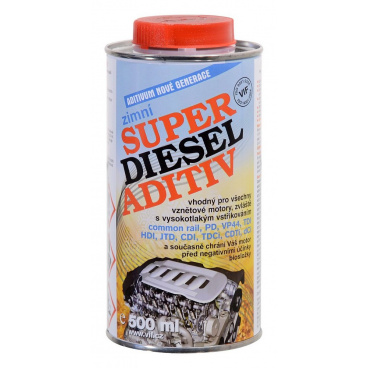 Zimní aditivum do nafty SUPER DIESEL ADITIV je multifunkční přísadou s protikorozním účinkem. Prodlužuje životnost palivového systému díky ochraně palivového čerpadla a údržbě čistoty vstřikovacích trysek. Udržuje nízkou spotřebu paliva a zlepšuje provozní pohotovost vozidla v zimním období zvýšením cetanového čísla nafty. Zimní aditivum SUPER DIESEL ADITIV oproti letní verzi obsahuje tzv. depresant, který snižuje bod tuhnutí a filtrovatelnost nafty při nízkých teplotách až o 5 °C. Protipěnivostní funkce přísady potlačuje pěnění paliva v celém palivovém systému. SUPER DIESEL ADITIV ochrání váš motor před negativními účinky biosložky, která je povinnou složkou každého paliva.