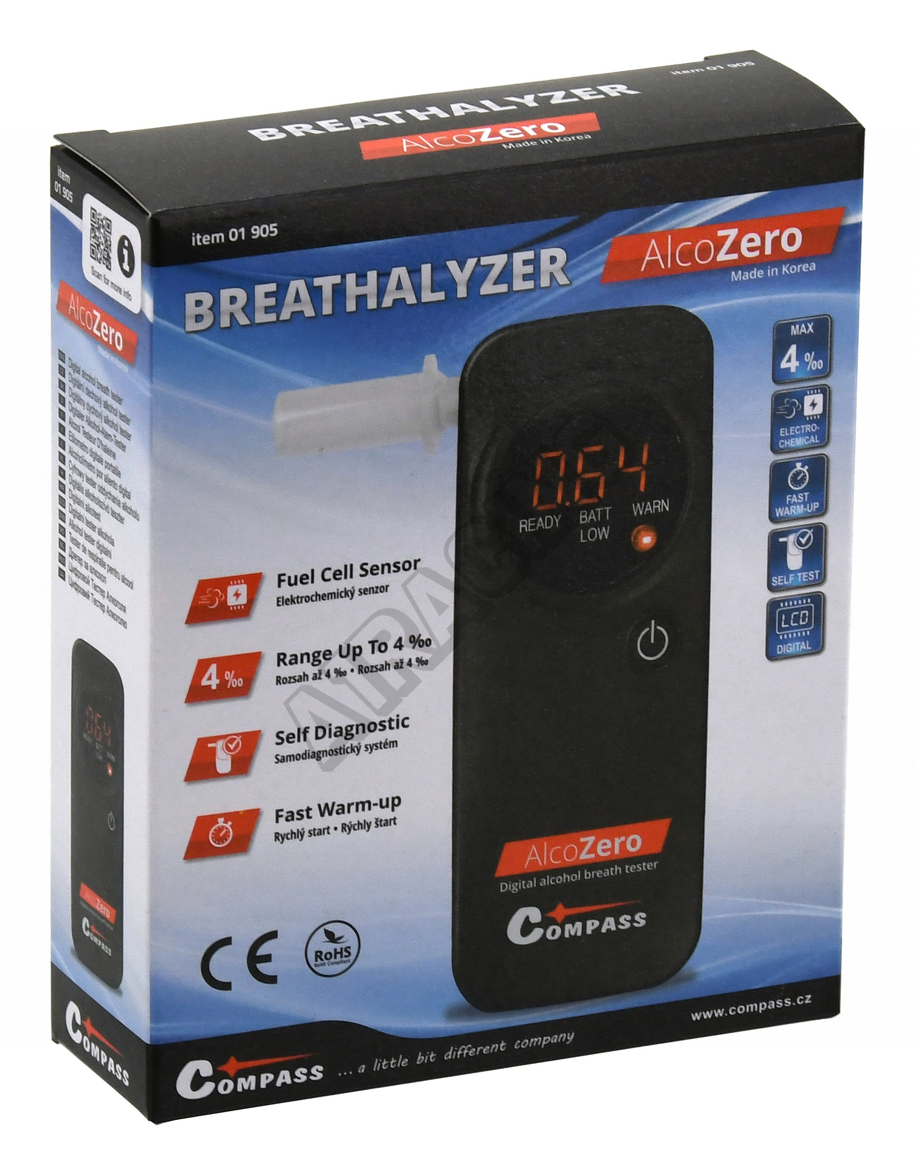 Je osazen přehledným displejem a signálními LED. Pracuje s rozsahem měření 0 - 4‰ alkoholu v krvi, s napájením 2x AAA bateriemi.