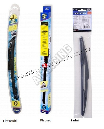 Stěrače FLAT SET (sada 2 ks na celé auto). Vysoce kvalitní pružný člen plochého stěrače zajišťuje stejnoměrný tlak grafitového břitu v celé jeho délce, což zamezuje rozmazávání nečistot a vytváření pruhů.