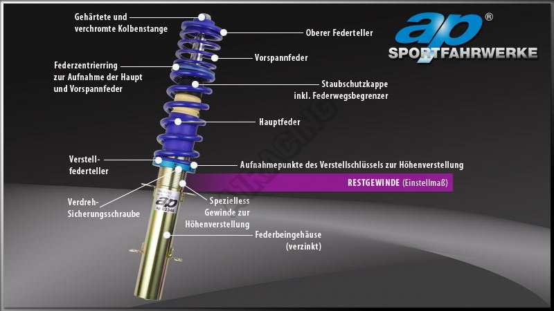 - tyto výškově stavitelné podvozky od německého výrobce ap Sportfahrwerke patřící do skupiny KW Automotive nabizí velmi dobrou kvalitu za příznivou cenu. Charakteristika kompletních podvozků nabízí sportovní požitek z jízdy a zároveň vyšší bezpečnost. Všechny tyto kompletní podvozky mají schválení evropskou zkušebnou TÜV.