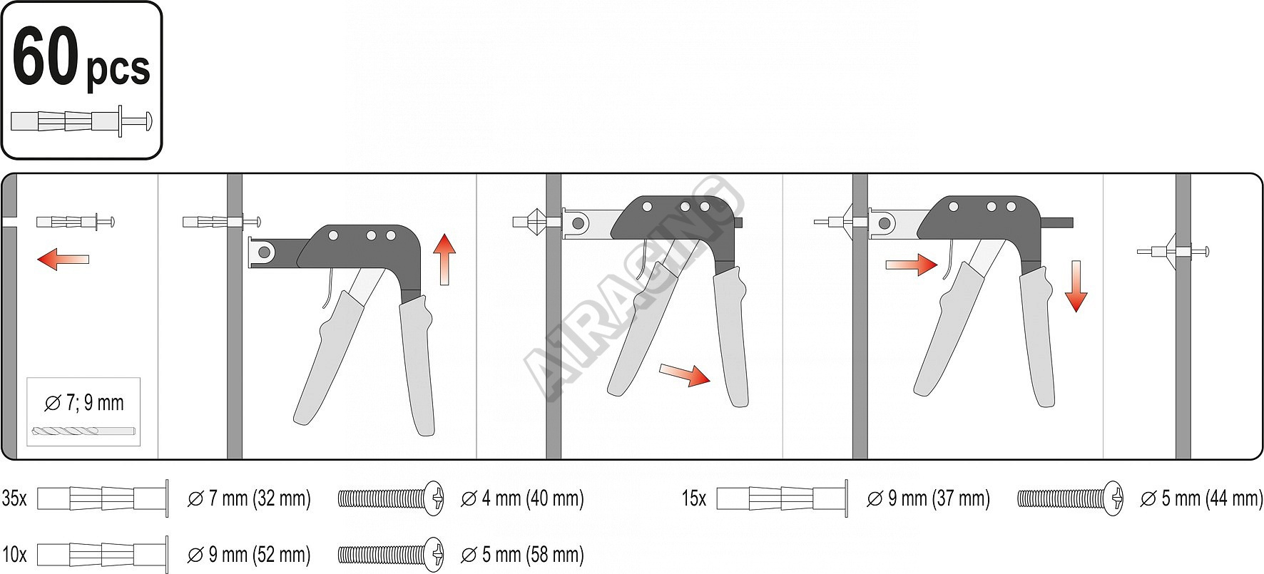 Aplikační kleště + Molly hmoždinky (kotvy) do sádrokartonu, sada 60 ks