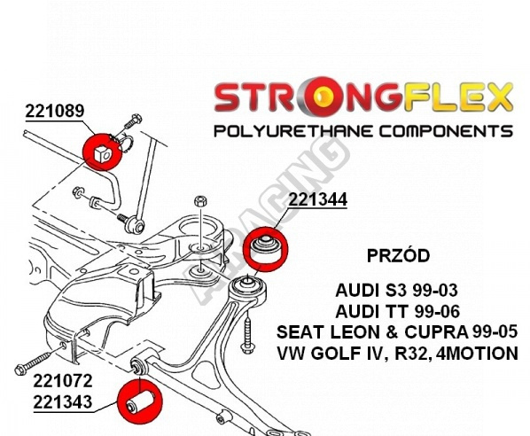 Audi TT 1999-06 StrongFlex Sport (tvrdost 90ShA) kompletní sestava silentbloků na celé auto obsahuje :