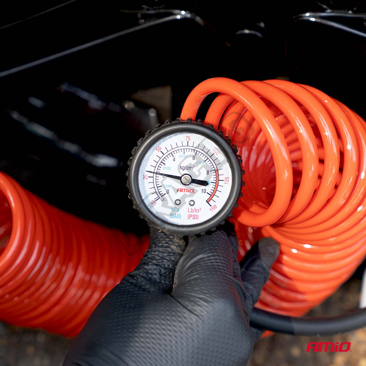 Kompresor je vybaven flexibilní vzduchovou hadicí o délce 8 m a napájecím kabelem 2,4 m, což umožňuje volné operování kolem vozidla. V sadě se nacházejí tři vyměnitelné koncovky pro pumpování různých typů ventilů – automobilových, cyklistických a pro sportovně-rekreační příslušenství.