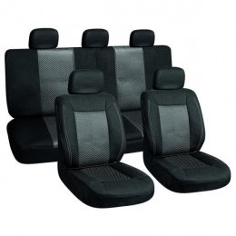 Univerzální potahy na přední a zadní sedadla včetně 5ks opěrek hlavy. • Lze použít na sedadla s airbagy. • Složení svrchního materiálu: 100% Polyester • Barva: černá/šedá