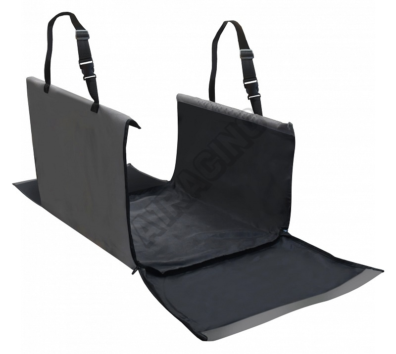 Ochrana je opatřena zipy, umožňující otevření boků, pro pohodlný nástup psa. Ochrana je navíc na bocích opatřena popruhem s karabinou pro uchycení obojku.