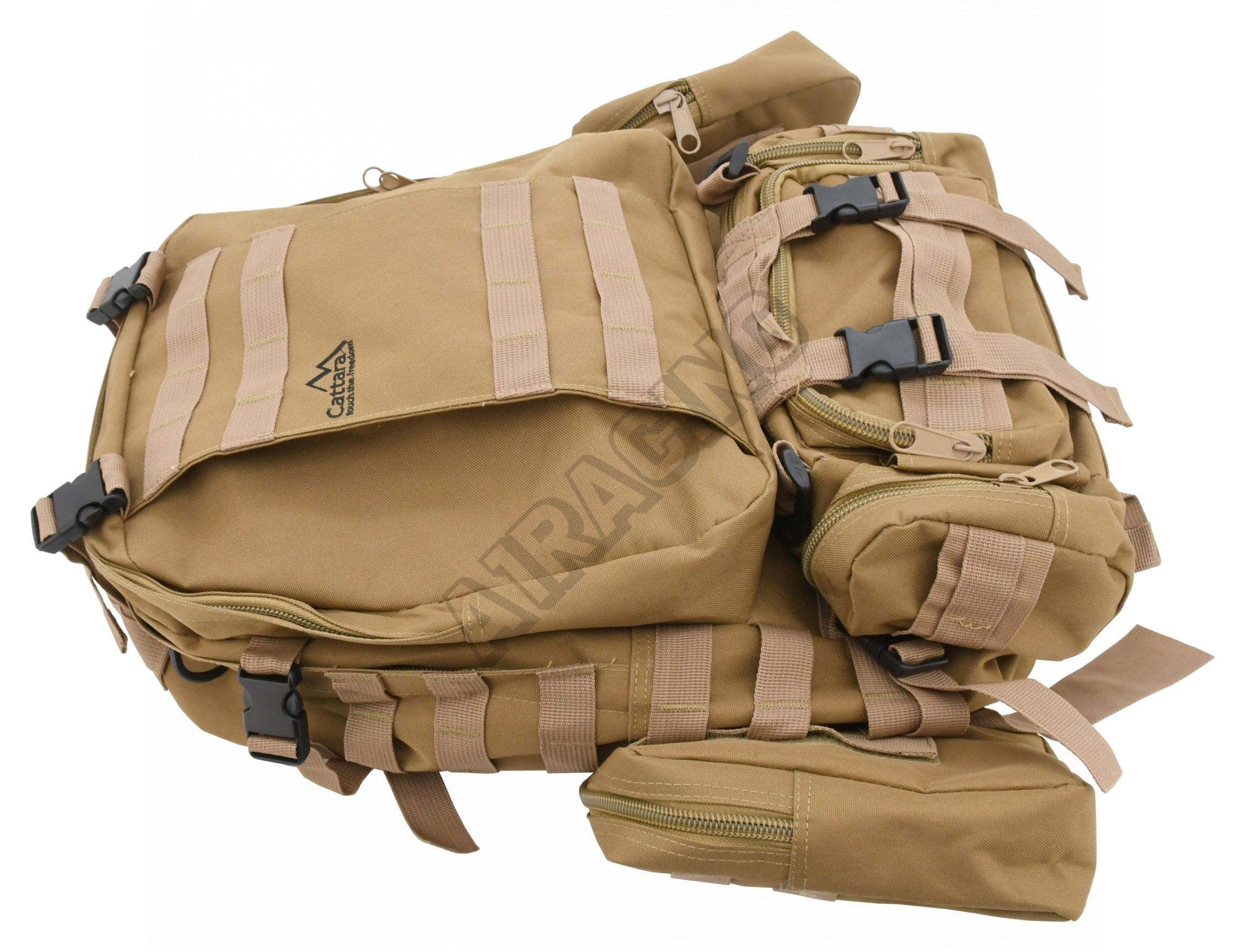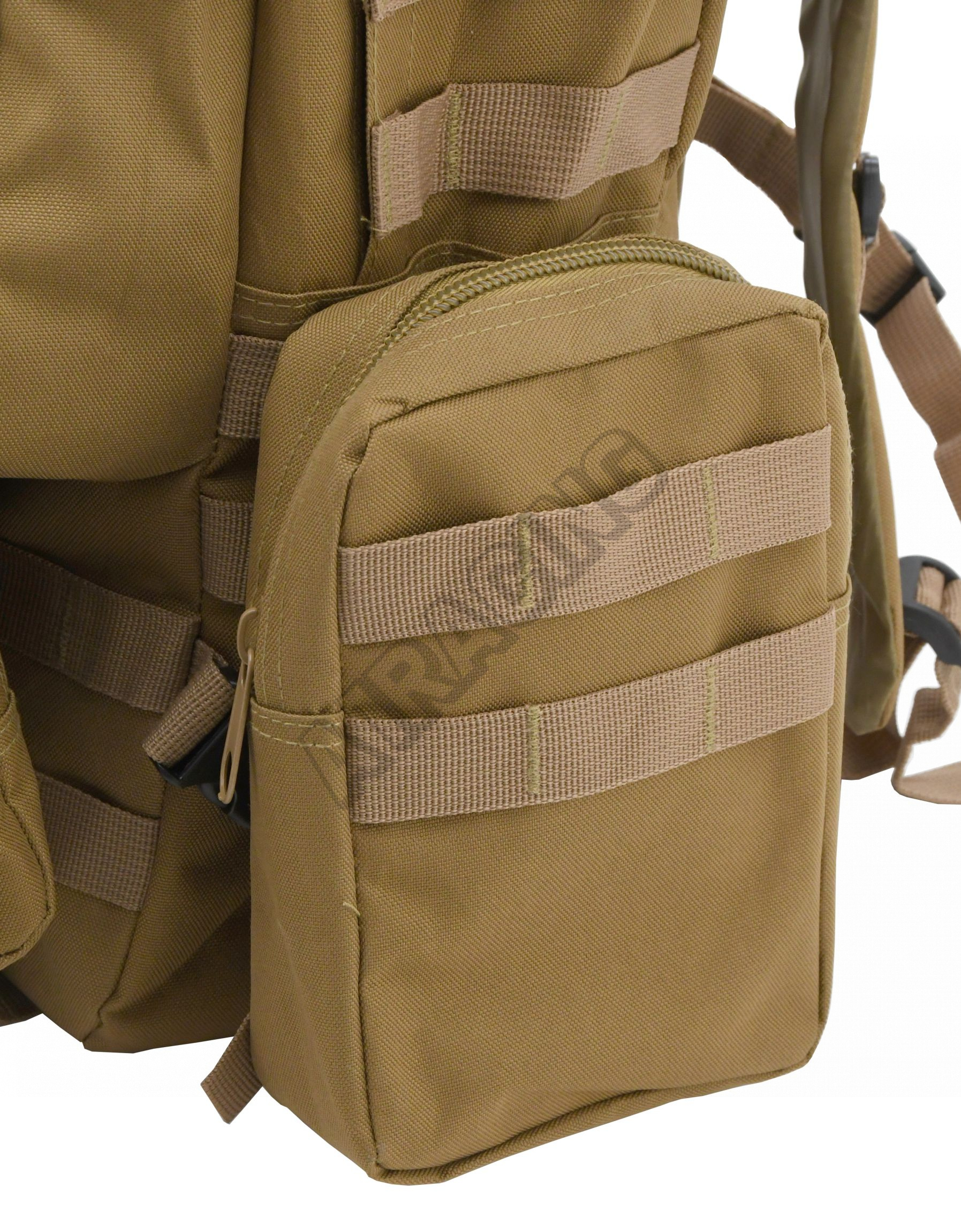 Zhotovení ze 100% polyesteru s voděodolnou PVC vrstvou z vnitřní strany. Batoh má rozměry 50 x 52 x 26 cm a nabízí objemný prostor až pro 55L předmětů. Na čelní straně a na bocích je doplněný o sumky, které lze jednoduše sundat, či umístit na jiné místo s Molle vazbou.