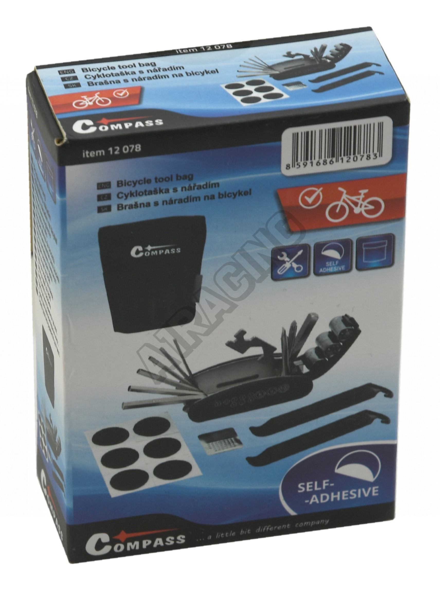 Praktická brašnička s multifunkčním nástrojem a samolepícími záplatami na duše, se snadným uchycením