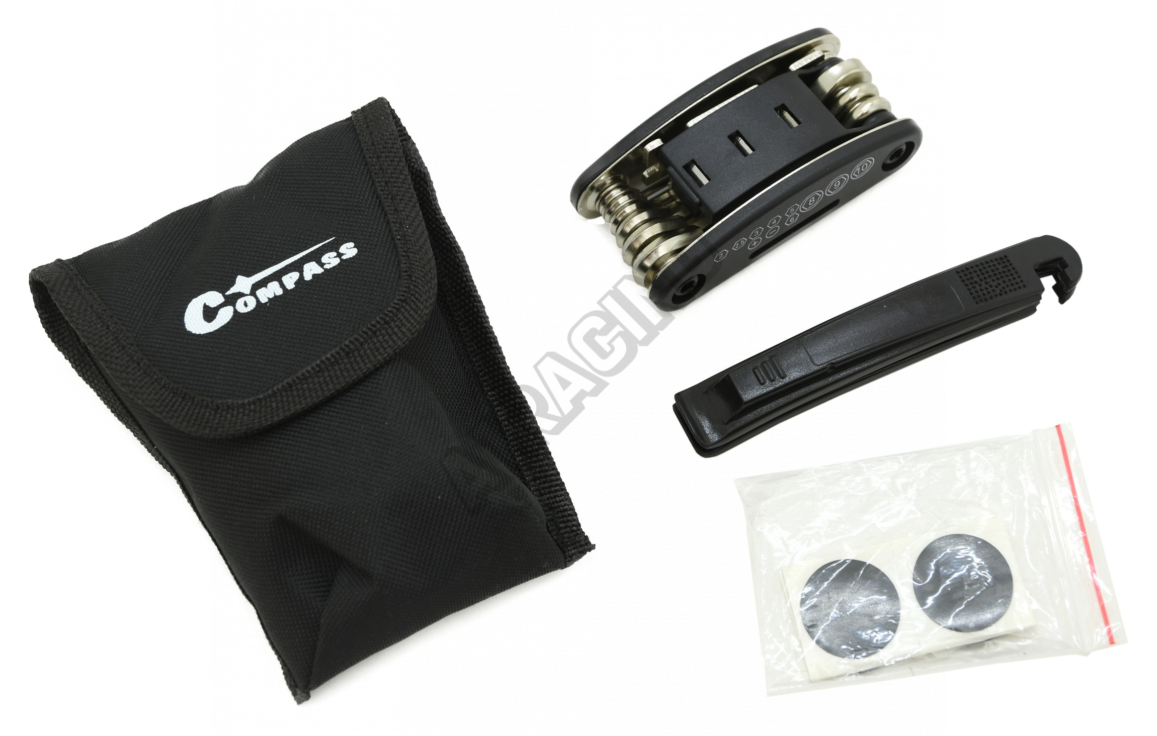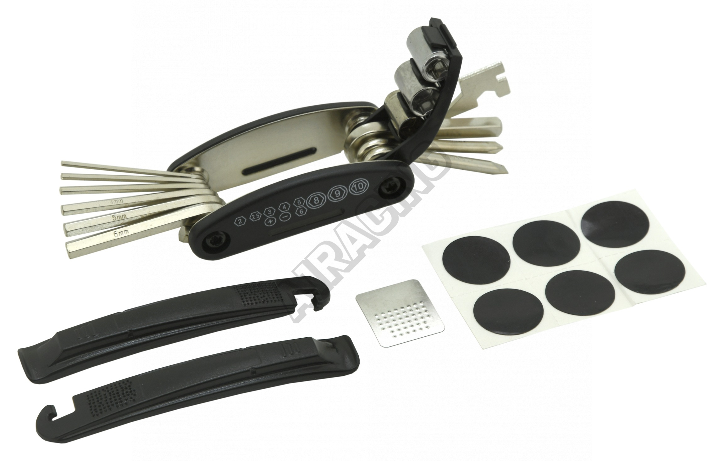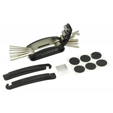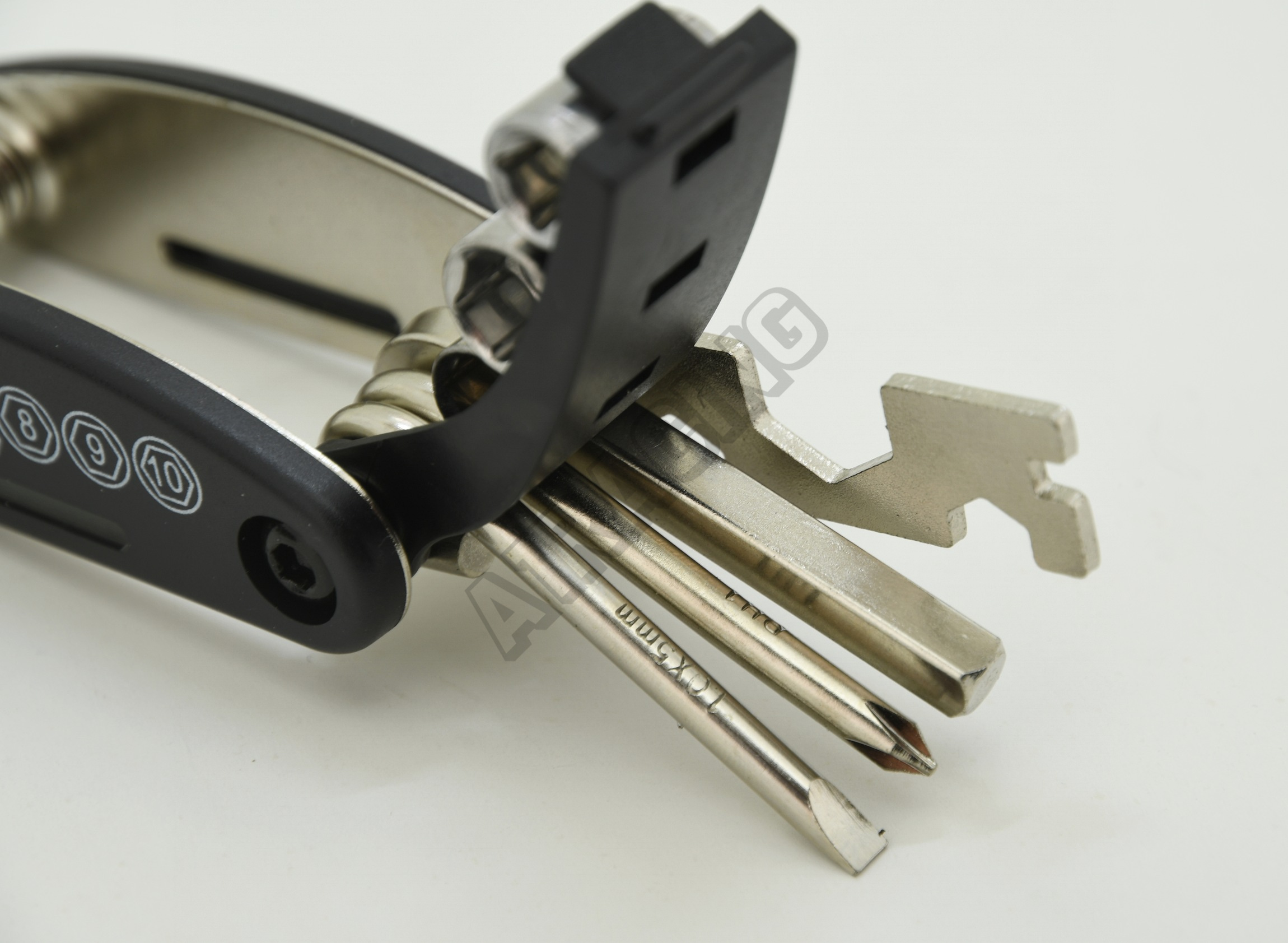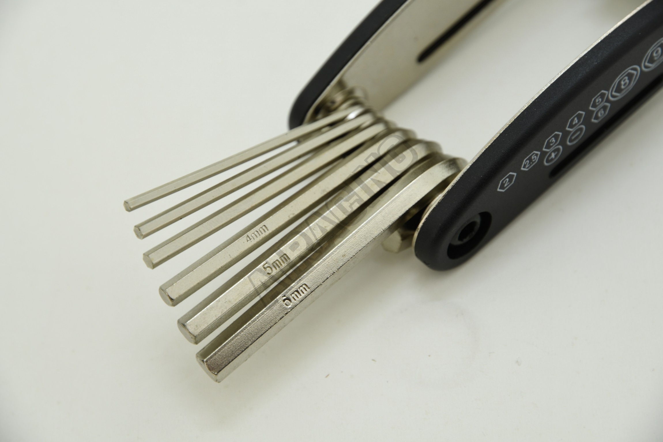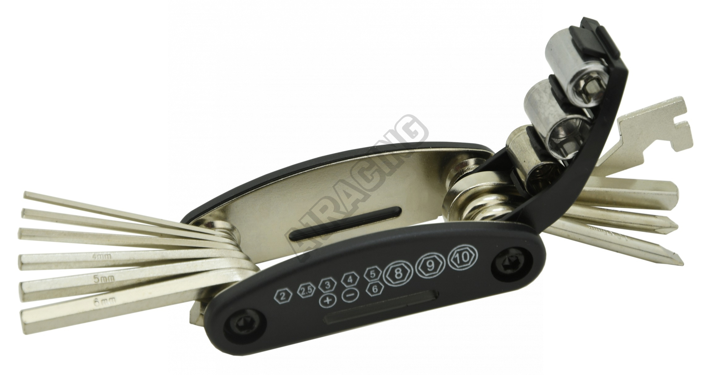 Multitool je složen z 6x imbusových klíčů (2/2,5/3/4/5/6 mm), křížového a plochého šroubováku, stranovým klíčem (8/10/15 mm a klíčem 14GE na výplet kol) a v neposlední řadě čtyřhranným šroubovákem spolu s HEX nástavci (8/9/10 mm).