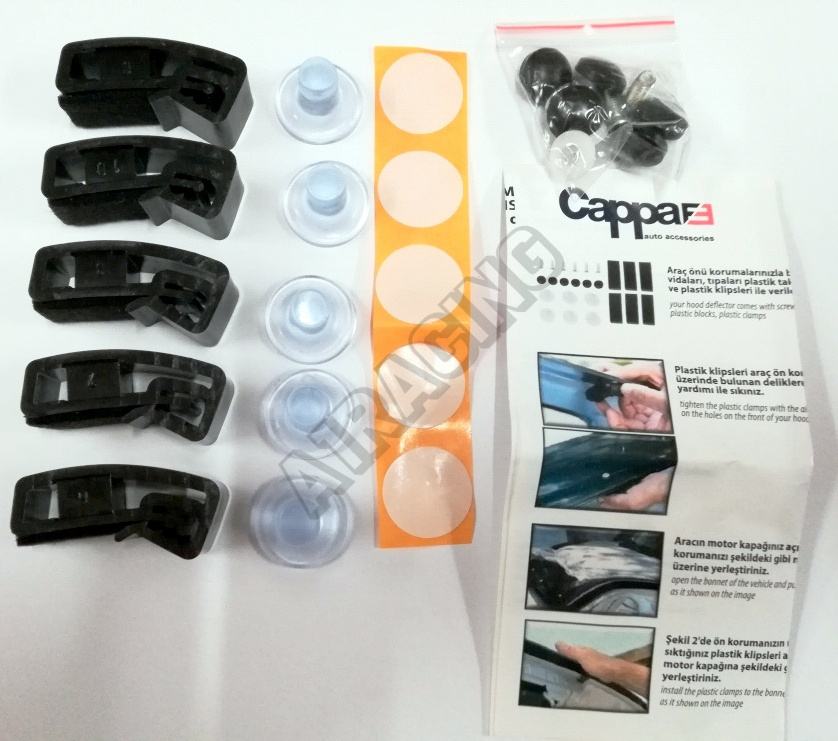 Pozor : Nic se nemusí vrtat. Vše se instaluje na původní uchycení z vnitřní strany kapoty. V horní části je pruhledná fólie, která před použitím se sundá dolů.