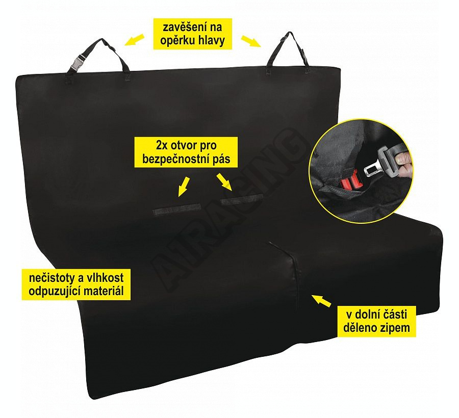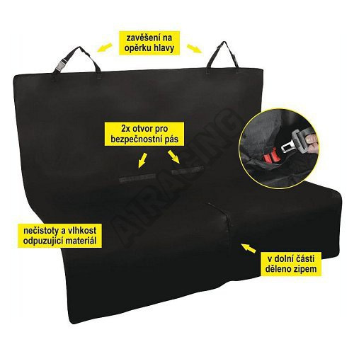 Deka je určena k upevnění na zadní sedadlo jednoduchým zavěšením za opěrky hlavy. Dva uzavíratelné otvory na bezpečnostní pásy, dolní část dělená zipem pro snadné přizpůsobení deky různým vozů. Deka je omyvatelná, použitý materiál odpuzuje nečistoty i vlhkost.