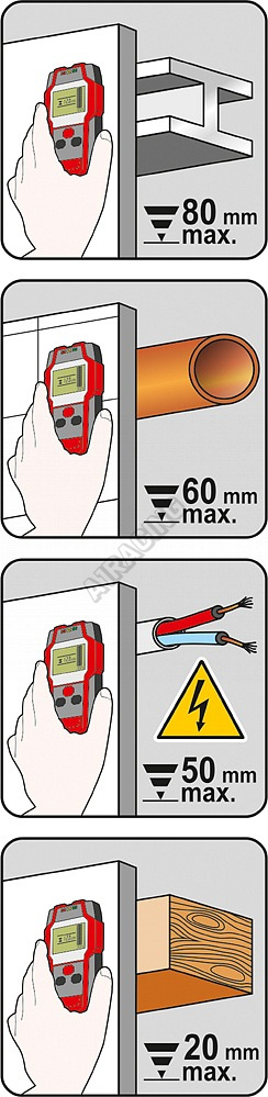 Detektor je schopen najít vodiče pod napětím, feromagnetické a diamagnetické kovové objekty a dřevěné nosníky nacházející se ve stěnách.