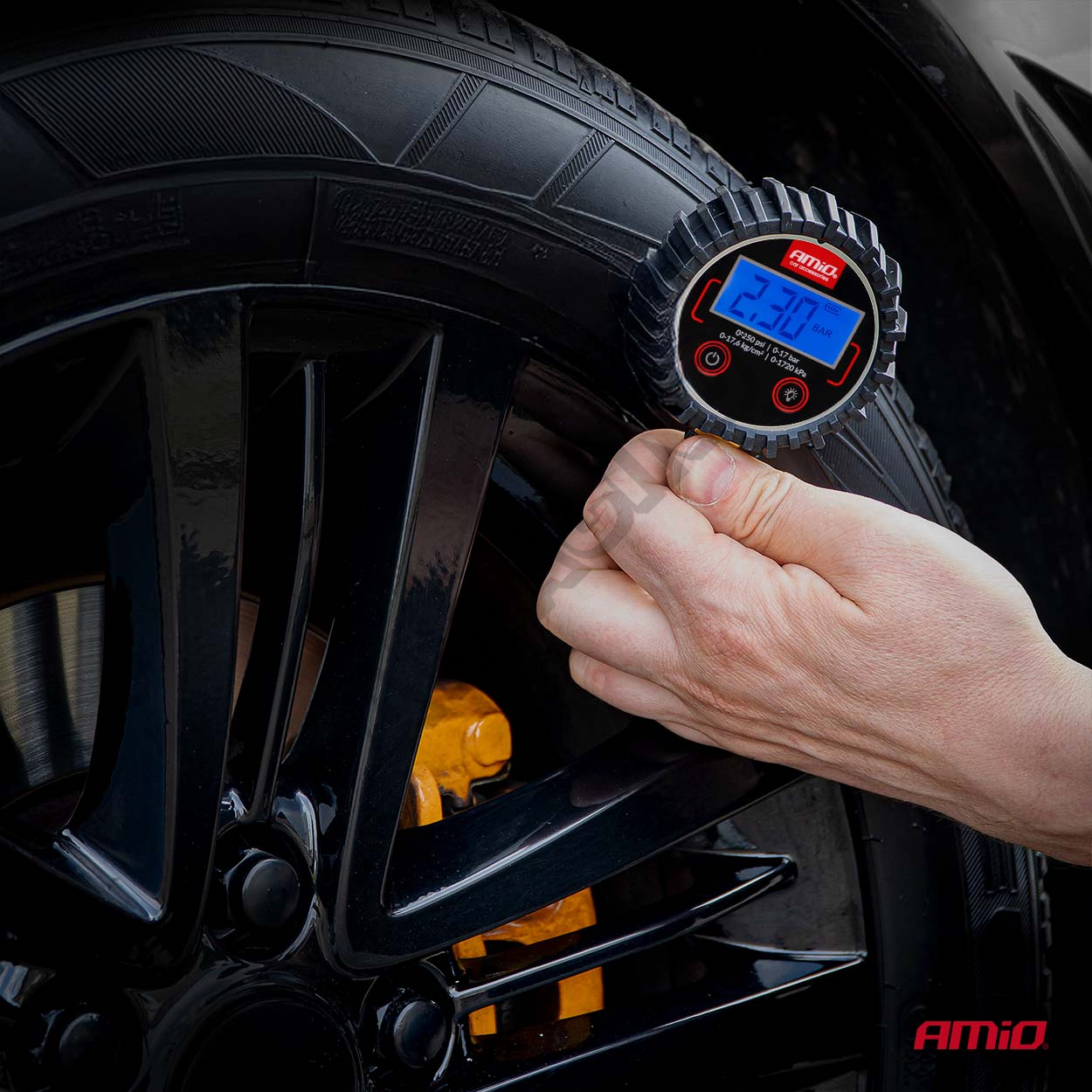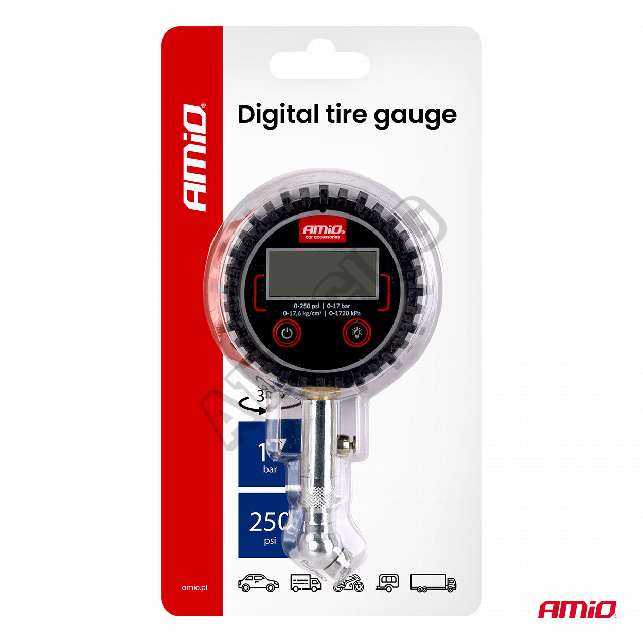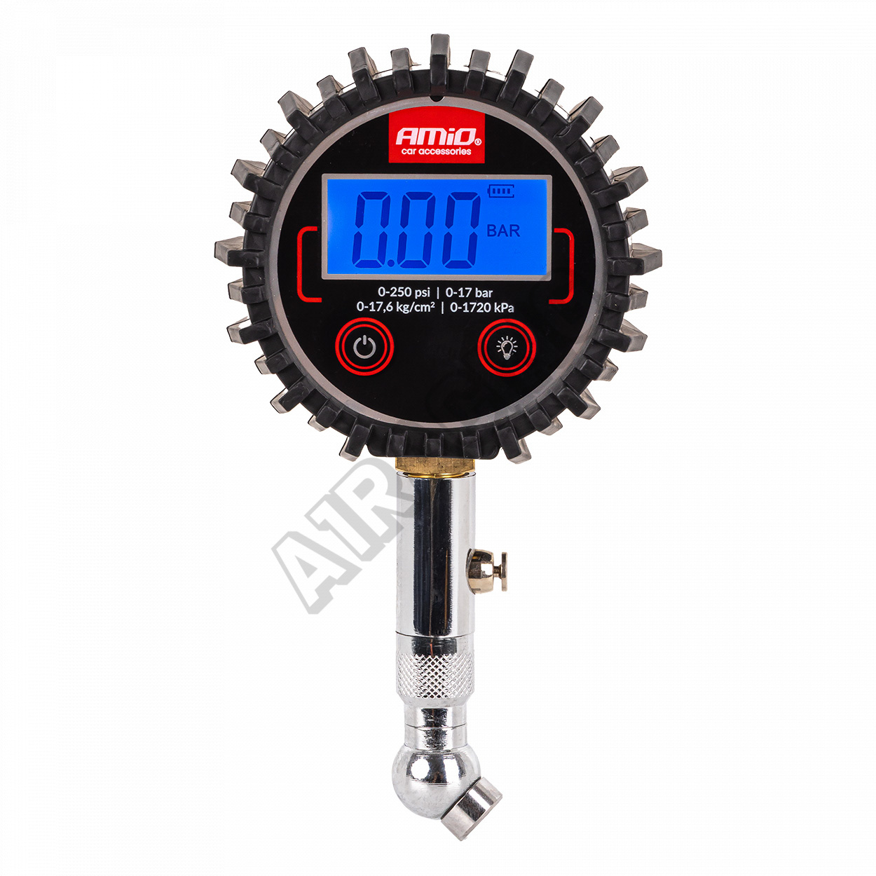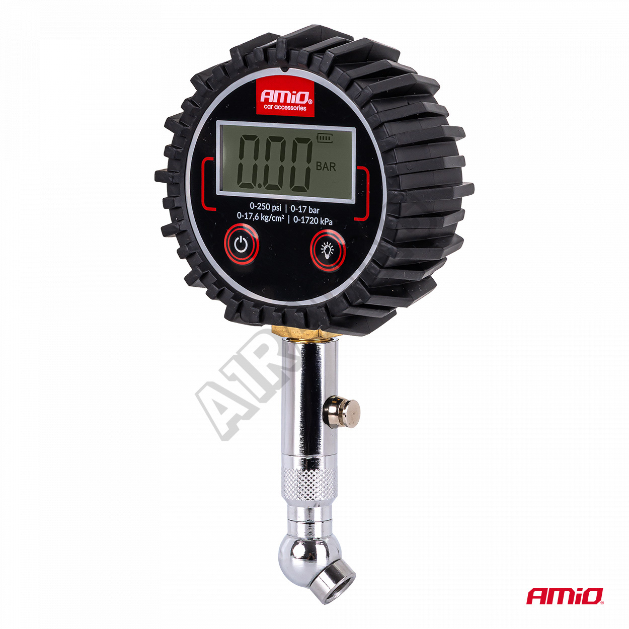 Digitální tlakoměr s otočnou hlavicí a resetovacím ventilem je profesionální nástroj určený ke kontrole tlaku v pneumatikách. Vybaven digitálním displejem zaručuje přesná a rychlá měření až do 17 barů. Pohyblivá hlava umožňuje pohodlný přístup k ventilům na těžko dostupných místech a vypouštěcí ventil umožňuje snadnou úpravu tlaku bez nutnosti sundávání přístroje.