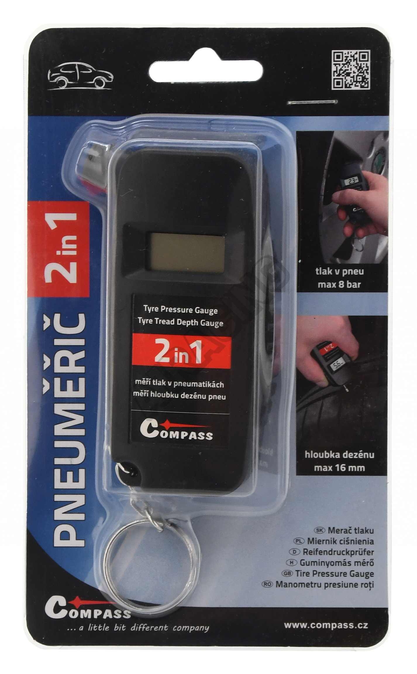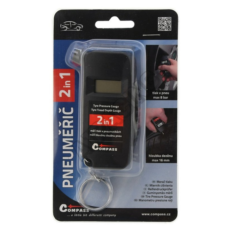 Umožňuje měření tlaku v pneumatikách až do 8 bar a zároveň dokáže digitálně změřit hloubku dezénu pneumatik až do 16 mm.