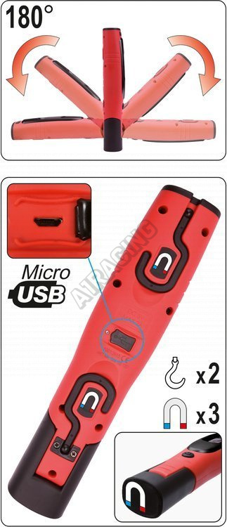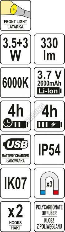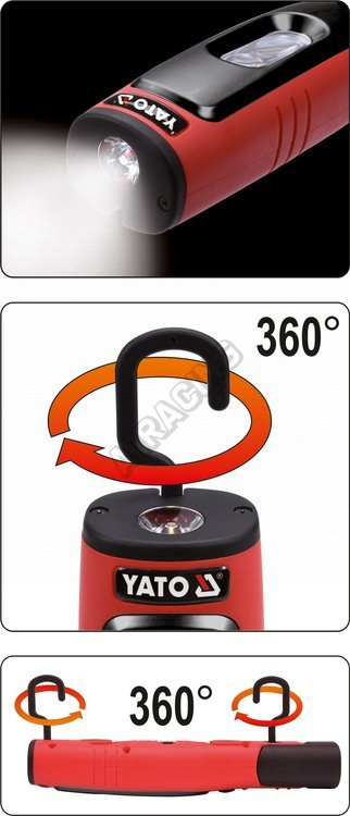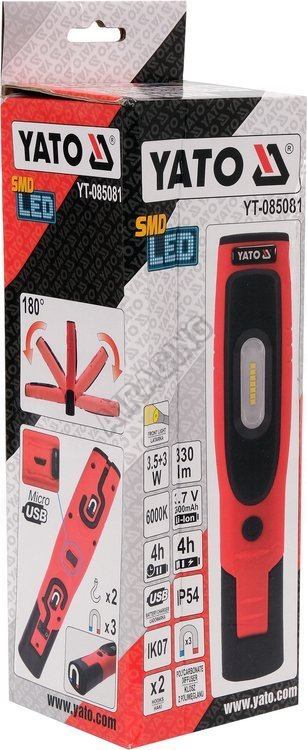 Nabíjecí dílenská lampa YATO s 330lm hlavním světlem a 80lm baterkou. Model je vybavený prostornou, lithium-iontovou baterií s kapacitou 2600mAh, která poskytne minimálně 4 hodiny nepřetržitého provozu. Vyrobeno z odolných materiálů vč. ABS a polykarbonát, které zajišťují třídu mechanické ochrany IK07 a třídu těsnosti IP54.