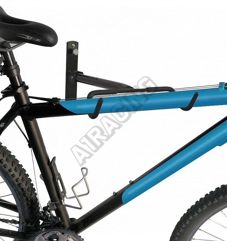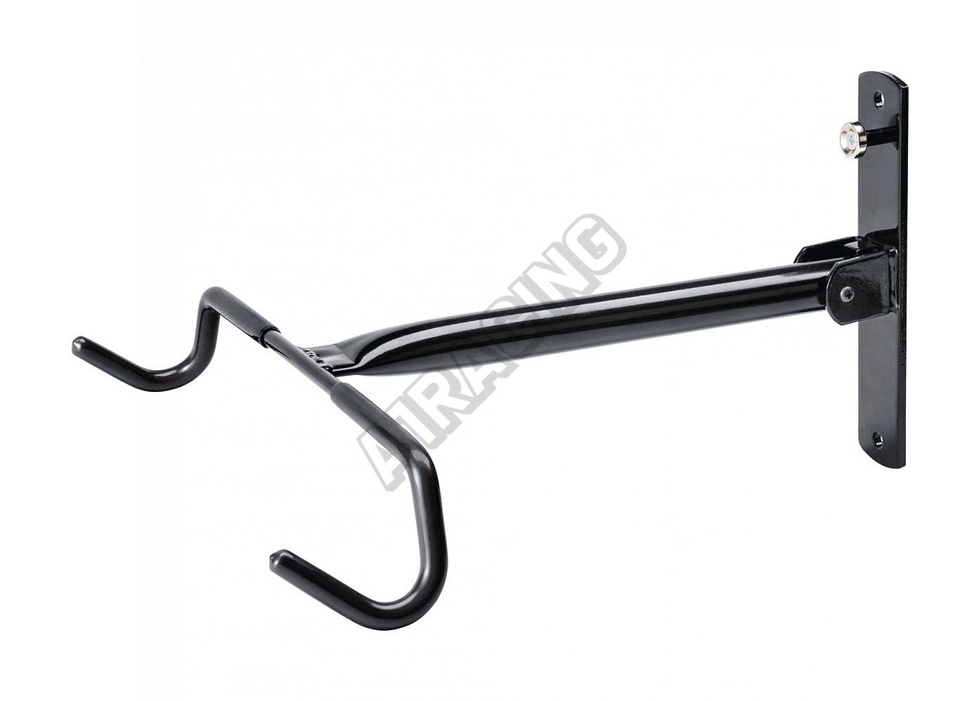Sklápěcí kovový držák jízdního kola určený k montáži na stěnu. Držák je tvarován pro zavěšení za rá