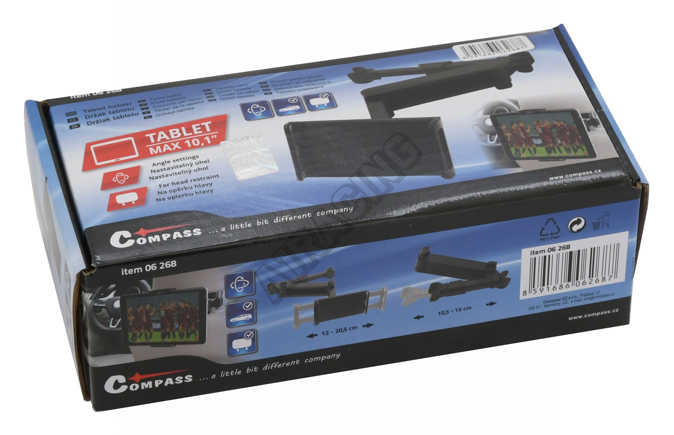 Držák pro tablet pro upevnění na opěrku hlavy. Rozsah úchytu tabletu 12 - 20,5 cm umožňuje upevnění