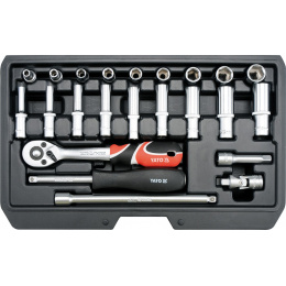 Gola sada 1/4" obsahuje 23ks: nástavců, prodlužovacích nástavců, ráčnu s plastovou rukojetí a další příslušenství. Vyrobené z kvalitní oceli CrV50BV30, CrMo440 s funkcí AS-DRIVE. Ráčna má jemný 72 zubý chod.