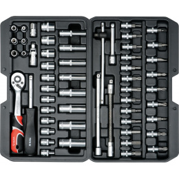 Gola sada 1/4" obsahuje 56ks: nástavců, prodlužovacích nástavců, ráčnu s plastovou rukojetí a další příslušenství. Vyrobené z kvalitní oceli CrV50BV30, CrV40, CrV6150, CrMo440 a S2 s funkcí AS-DRIVE. Ráčna má jemný 72 zubý chod.