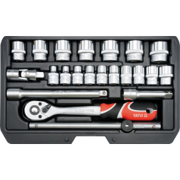 Gola set 3/8 "contains 22 pcs: attachments, extensions, articulated attachment, ratchet with plastic handle, and t-beam. Made of high-quality chrome-vanadium steel CrV6140 and CrV50BV30, S2 with AS-DRIVE function.