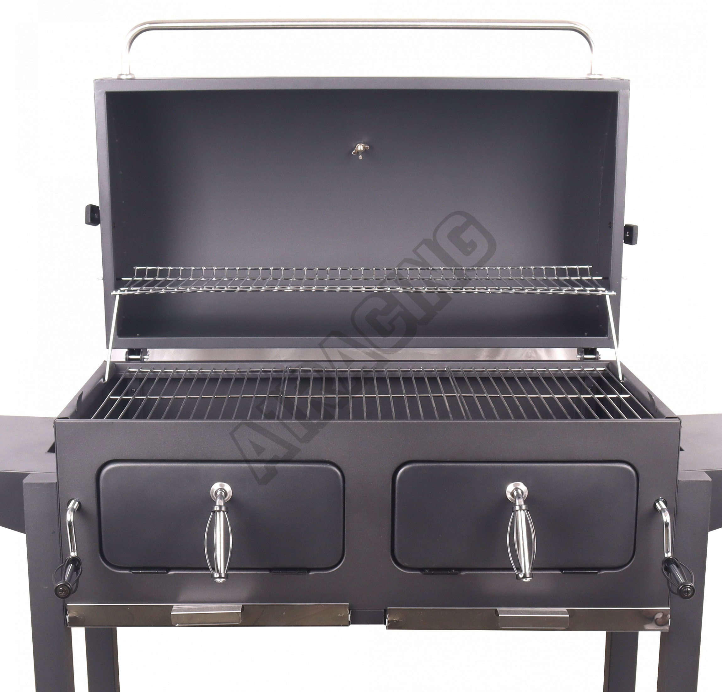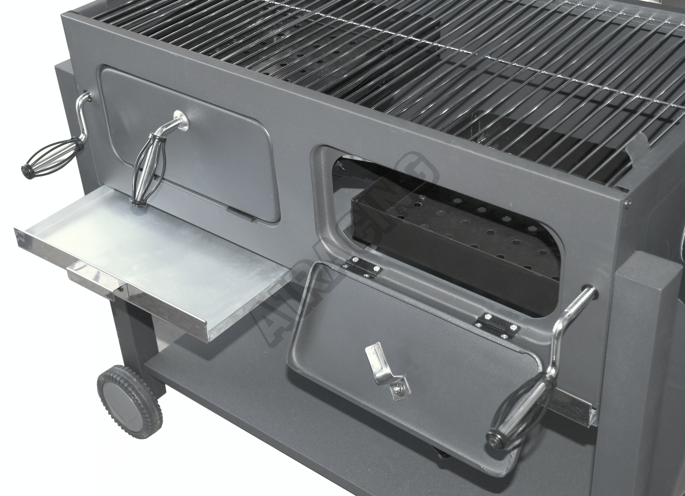Další předností grilu jsou rošty na uhlí s nastavitelnou výškou, grilovací prostor je tak možné regulovat pomocí mechanismů na přední straně, dle požadávků daných pokrmů. Dvířka na čelní straně grilu významně usnadňují doplňování uhlí. Pro usnadněné číštění jsou potom určeny zásuvky na popel v nejspodnější části grilovacího prostoru.