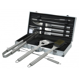 V sadě se nachází obracečka s precizně zabroušenou hranou vybavená zoubkovaným ostřím, otvírákem zátek a otvory pro odtok. Kleště, speciálně tvarované pro jistý úchop nejrůznějších pokrmů, kartáč pro údržbu grilu, kdy samotná kartáčová část je z mosazi. Nepostradatelnou částí grilovcího nářadí je i dvouzubá vidlička, štětec se štětinami z nylonu, pro potírání, či mašlování pokrmů, porcovací nůž a 4x grilovací jehlice s hroty broušenými do špičky.