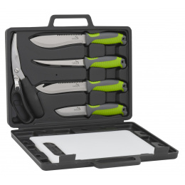 Grilovací sada skládající se ze 4 ks nožů, nůžek na drůbež a ryby a prkénka pro pohodlné porcování.