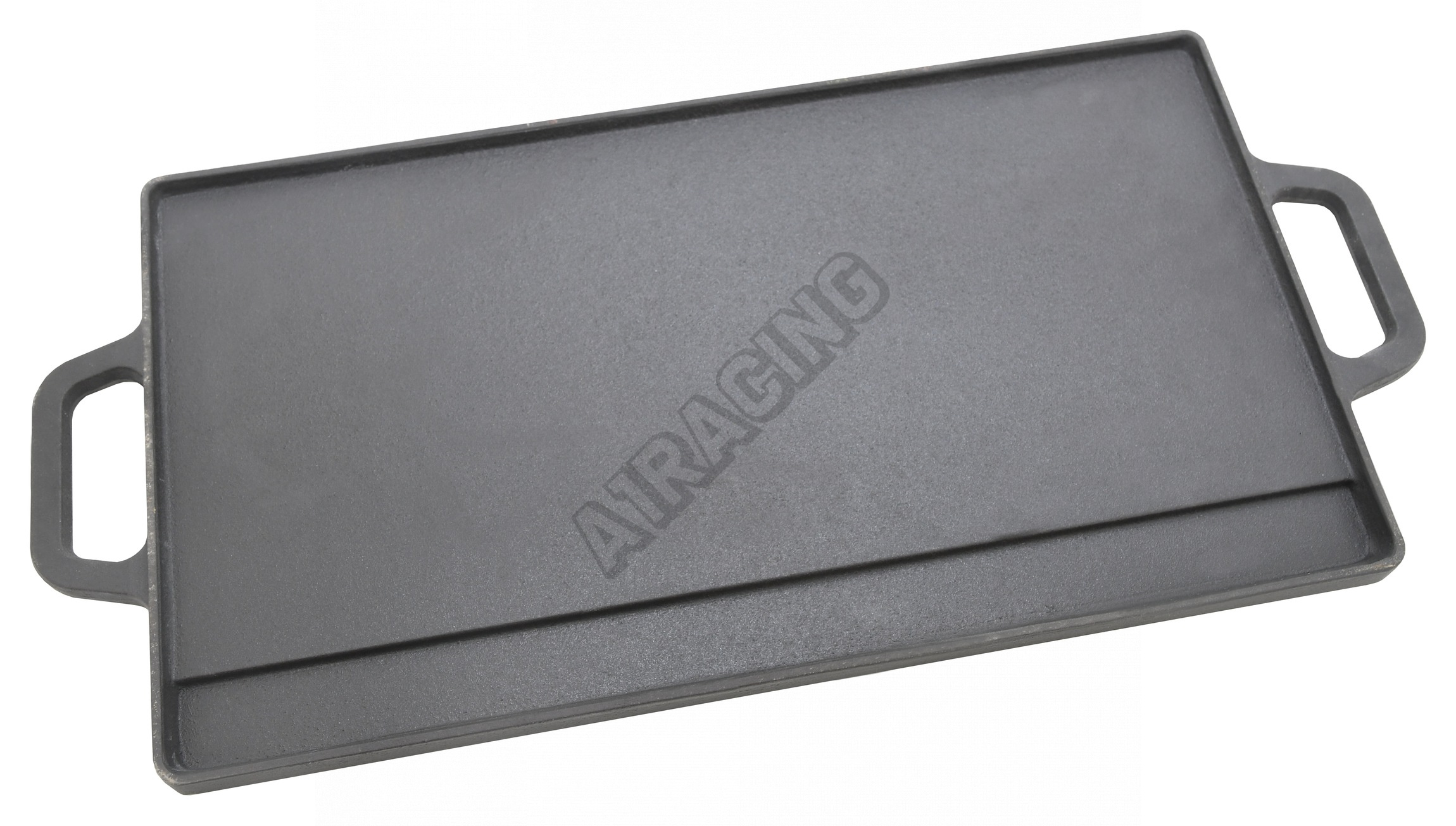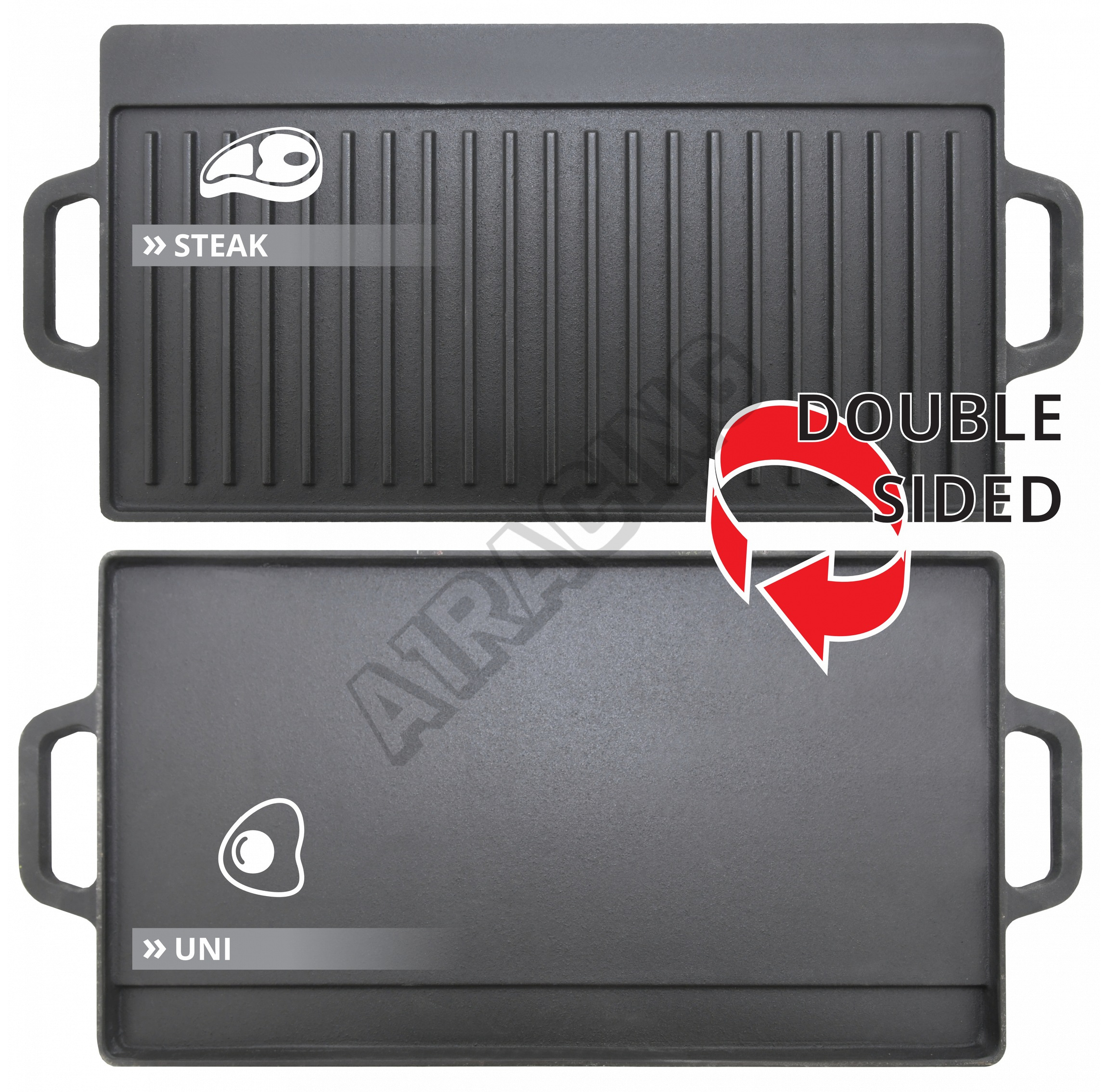 Je oboustranný a nabízí prostor pro tepelnou úpravu masitých pokrmů s typickou drážkovanou strukturou.