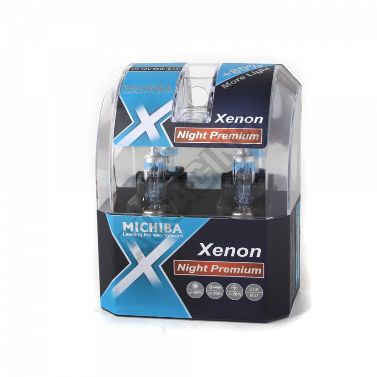 Halogenová autožárovka MICHIBA s paticí H7, 55W, Night Premium se zvýšenou svítivostí až o 80%.
