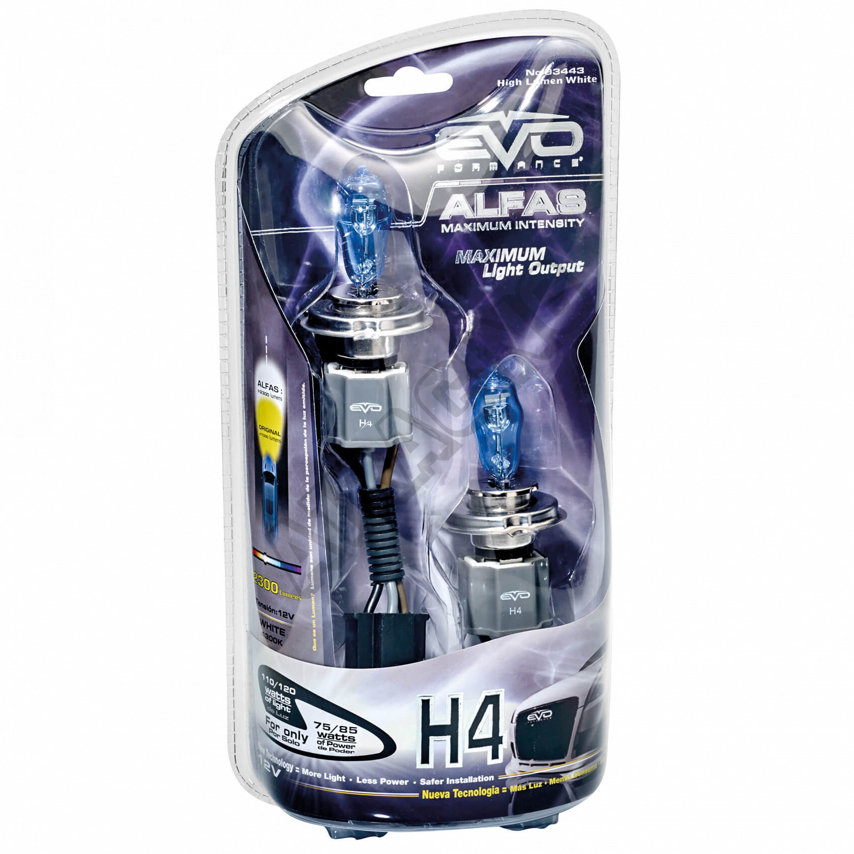 Halogenové žárovky EVO High Lumen White dostupné v 6 různých provedeních [H1, H4, H7, H11, HB3 (9005) a HB4 (9006)] v blistrovém balení s 2 žárovkami v balení. Žárovky nahrazují původní světlomety za účelem zlepšení viditelnosti díky vysokému výkonu 4,300 kelvinů a 85 W vydávajícím 2,300 lumenů což je více než dvojnásobná intenzita než původní žárovky.