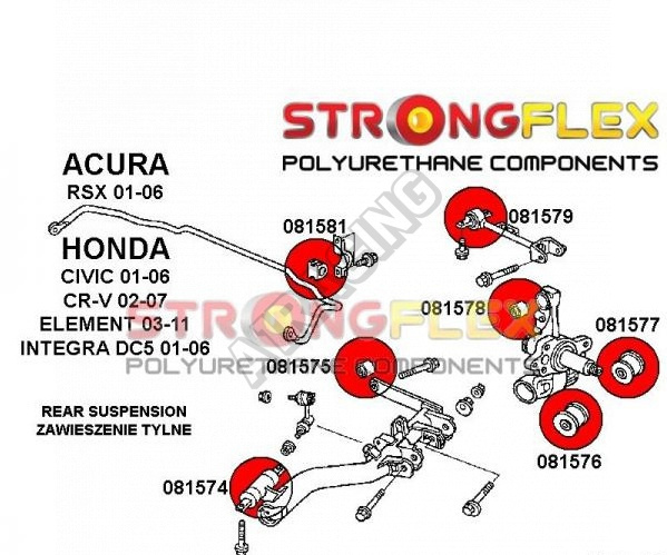 Honda Civic 2001-05 StrongFlex (tvrdost 80ShA) kompletní sestava silentbloků na celé auto obsahuje :