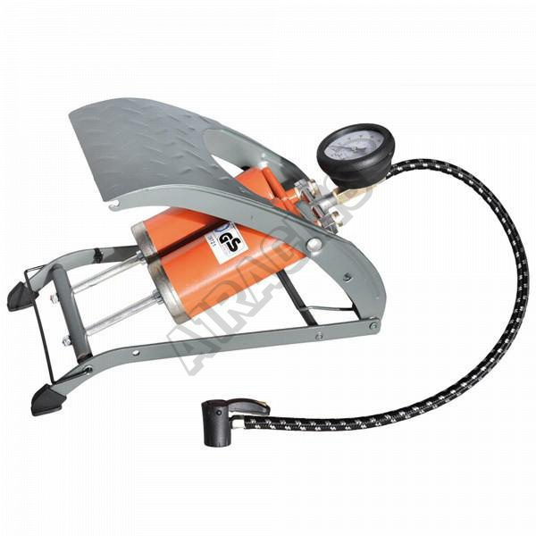 Kovová nožní hustilka se jedním pístem, určená pro huštění pneumatik osobních automobilů. Součástí balení jsou přídavné adaptéry pro huštění gumových matrací, míčů apod.