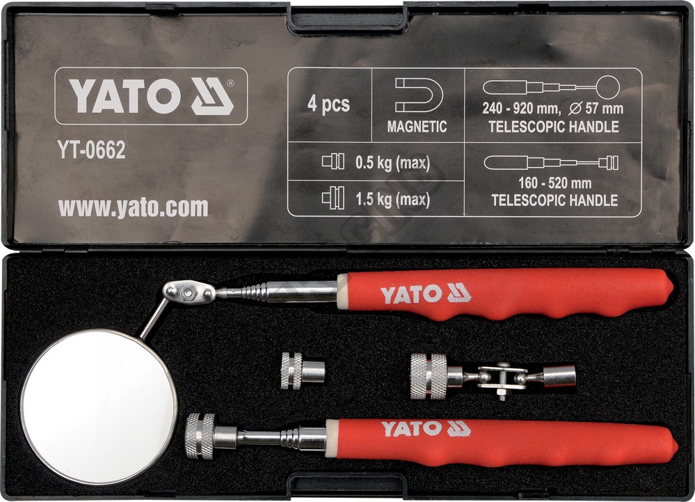 Sada obsahuje teleskopickou rukojeť délky 160 - 620 mm pro magnetické patky, teleskopickou rukojeť délky 250 - 930 mm s kloubovým inspekčním zrcátkem průměru 57 mm a magnetické patky 13; 16; 20 mm s nosností 0,5; 1; 1,5 kg.