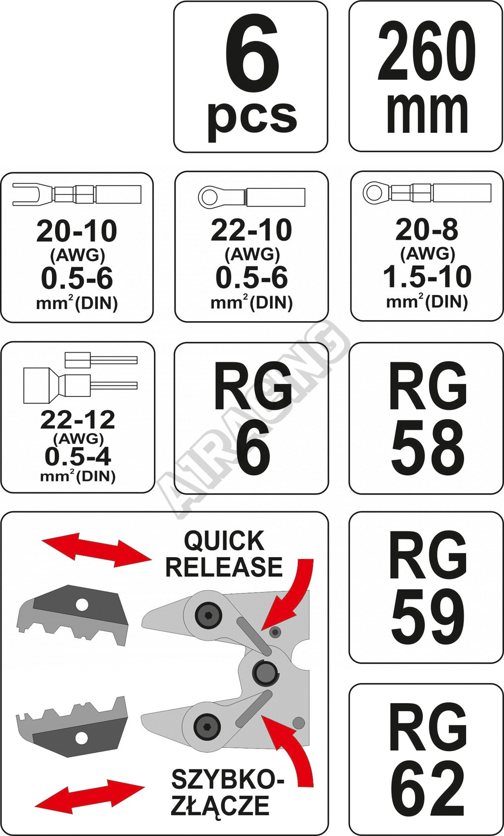 • pět výměnných matric pro lisování nejběžnějších typů konektorů, vč. neizolované, izolované, svorka, objímka, anténní konektory