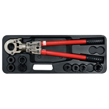 Lisovací kleště na plastové vodovodní potrubí PEX-AL-PEX, PERT-AL-PERT se sadou 8 výměnných čelistí