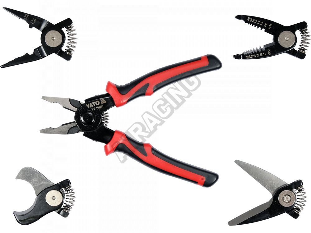 Pro řezání kabelů (rozsah řezání: 16 mm, materiál: uhlíková ocel), univerzální (rozsah řezání ocelového drátu: 3 mm, materiál: CrV60), pro řezání plechu (rozsah řezání ocelový plech 0,5 mm, nerez 0,3 mm, plasty 1,5 mm, materiál: 4Cr13), pro odizolování (rozsah: AWG 22-10, 0,6-2,6 mm, materiál: uhlíková ocel), pro krimpování konců drátů (rozsah: AWG 22-10, 1,5-6,0 mm), materiál: uhlíková ocel)