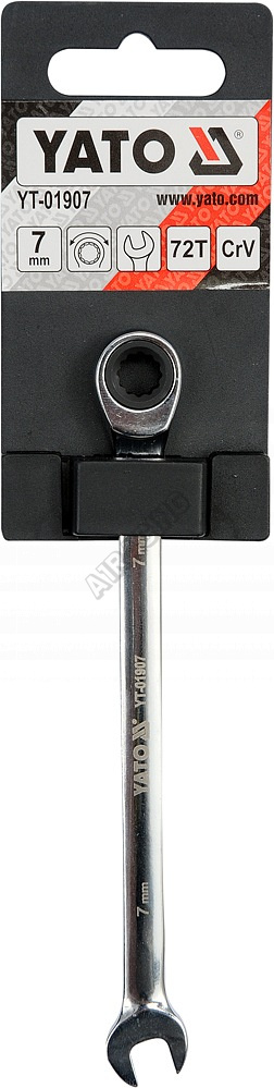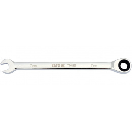 Ráčnový očkoplochý klíč Yato - na jedné straně klasický stranový klíč, na straně druhé očkový klíč s dvanáctihranným profilem vybaveným ráčnou s jemným dělením 72 zubů. Tělo klíče je vyrobeno z chromvanadiové oceli CrV6140. Povrch je vyleštěn do vysokého lesku.