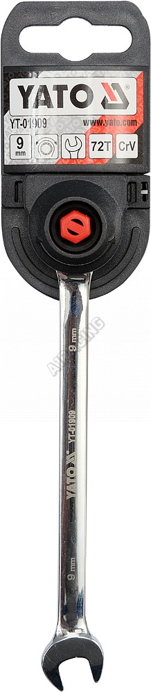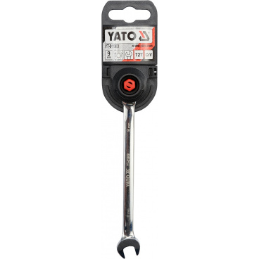 Ráčnový očkoplochý klíč Yato - na jedné straně klasický stranový klíč, na straně druhé očkový klíč s dvanáctihranným profilem vybaveným ráčnou s jemným dělením 72 zubů. Tělo klíče je vyrobeno z chromvanadiové oceli CrV6140. Povrch je vyleštěn do vysokého lesku.