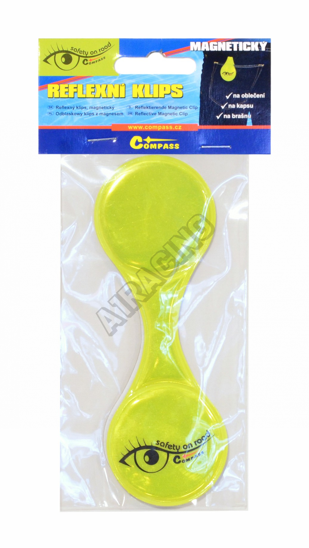 Magnetický reflexní klip, snadné upevnění na kapsu, na oblečení atp. Moderní, zábavný a především na velkou vzdálenost dobře viditelný doplněk, vhodné i pro děti.