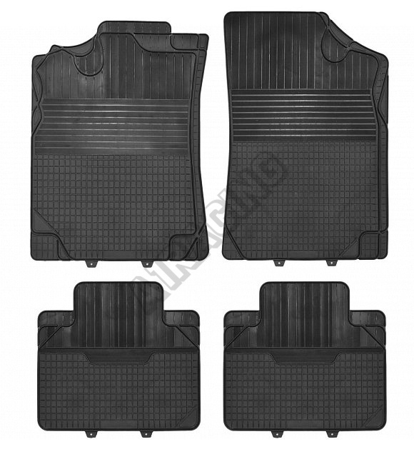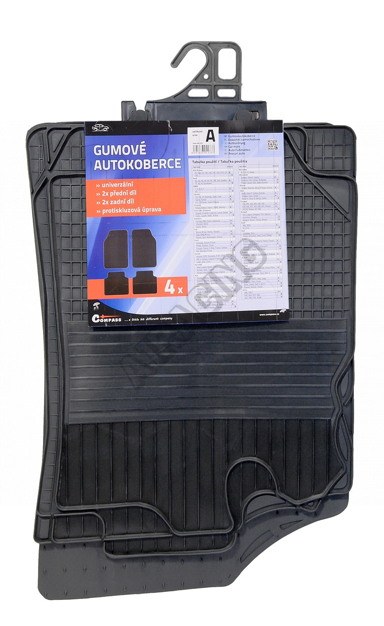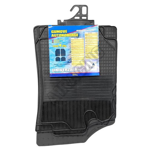 Univerzální gumové koberce do automobilu, nové provedení. V galerii fotek je vyobrazena tabulka základních typů vozidel, na které lze koberce použít. Velikost A. Sada 4 kusy (2×přední, 2×zadní díl). Barva černá.