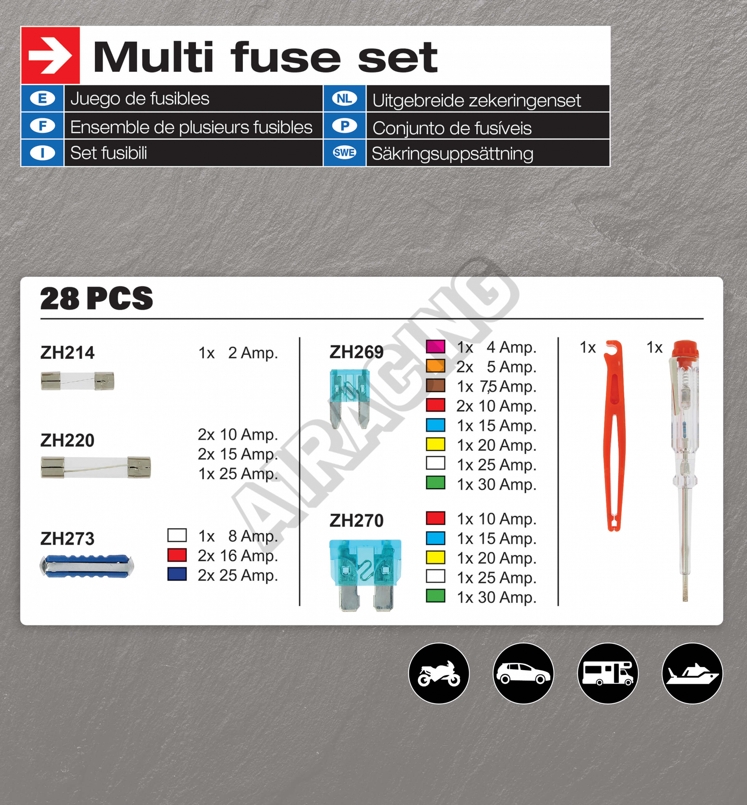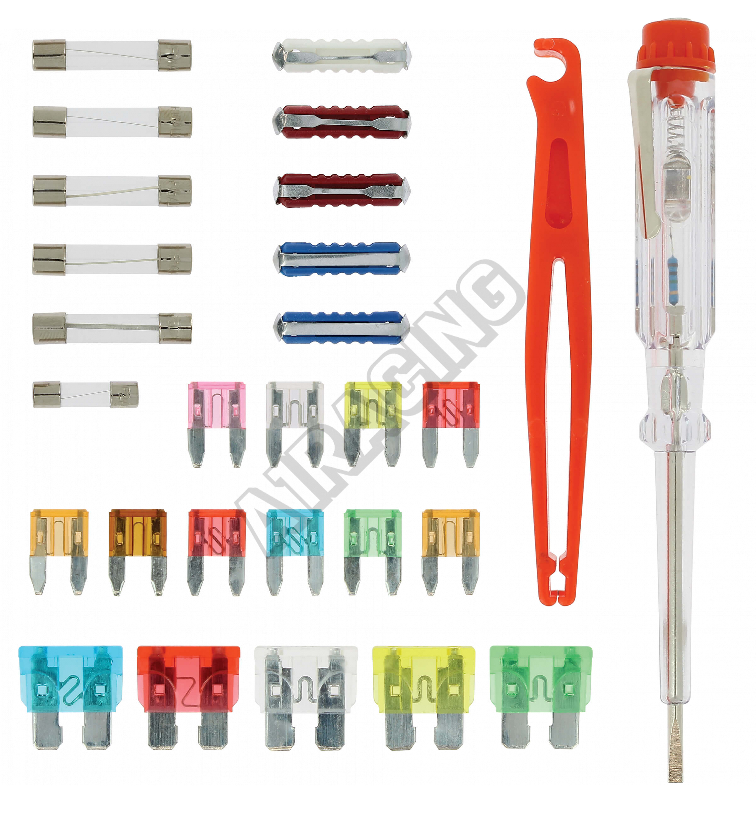 Univerzální sada malých, velkých i skleněných pojistek včetně zkoušečky a vytahovacích kleští. Kompletní rozpis je vidět v galerii fotek.