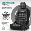 Potahy mají zámky na zadním sedadle, díky čemuž pasují na většinu sedadel dostupných na trhu (nedělené pohovky, dělené vpravo i vlevo).