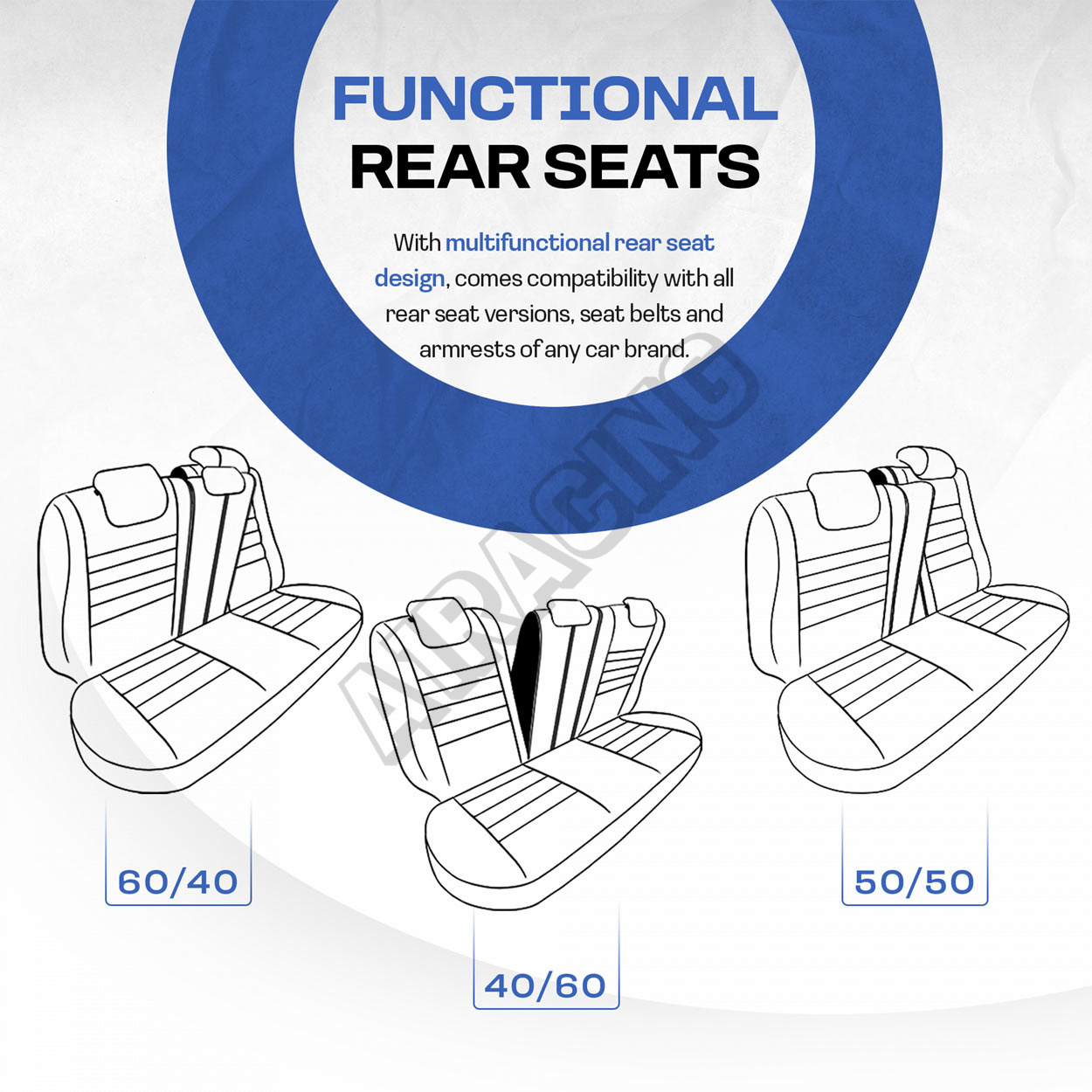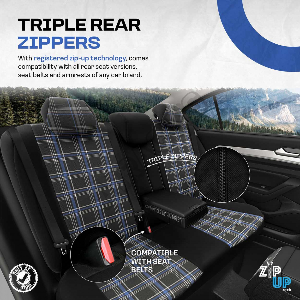 Potahy mají zámky na zadním sedadle, díky čemuž pasují na většinu sedadel dostupných na trhu (nedělené pohovky, dělené vpravo i vlevo).