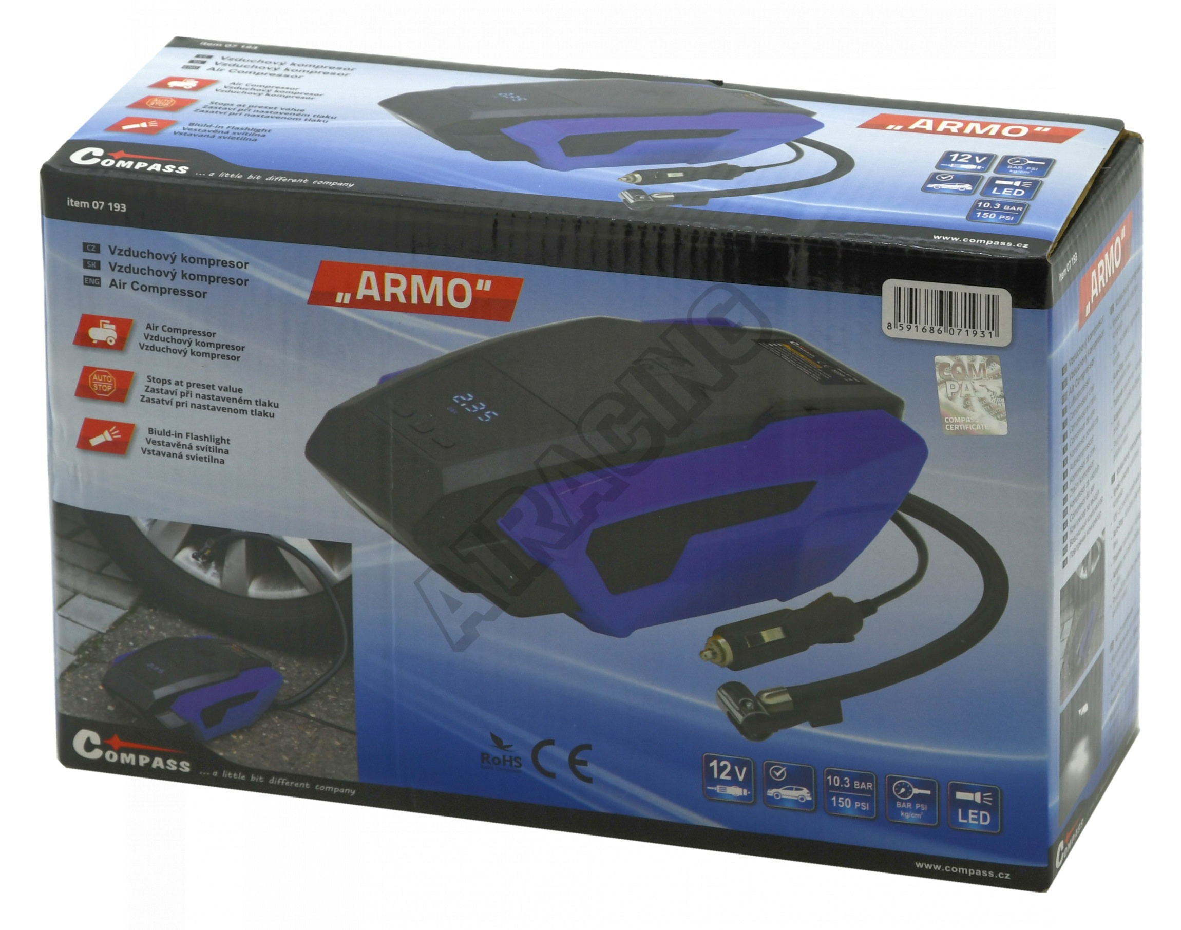 Vysoce výkonný kompresor s Auto-stop systémem a napájením z 12V zástrčky zapalovače vozidla. Kompre