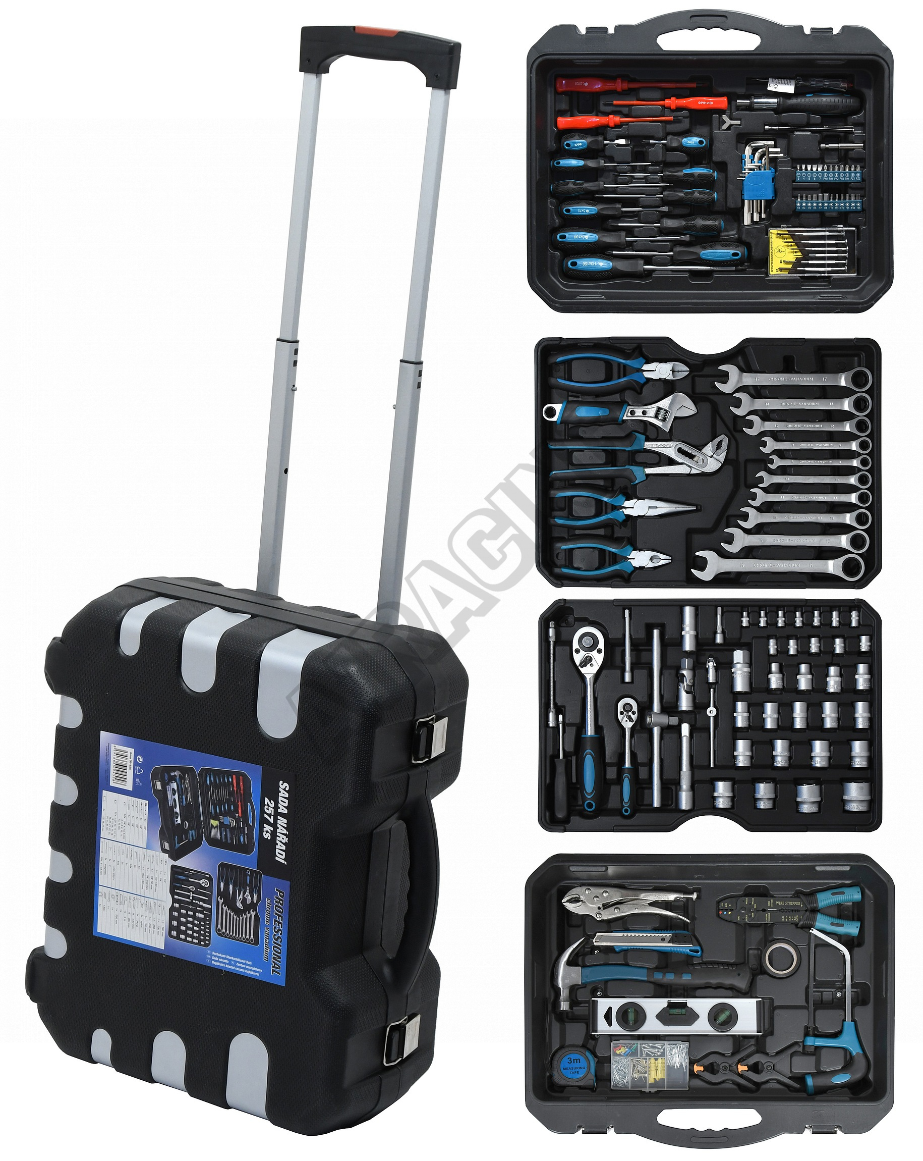 Spodní plato obsahuje kladivo, metr, samosvorné a odizolovávací kleště, spojovací materiál a další užitečné vybavení pro nejrůznější práce. Vložené plato s nejběžněji používanými kleštěmi a s vysoce kvalitními, Chrom-Vanadiovými ráčnovými klíči s velmi jemným 72 zubým chodem.