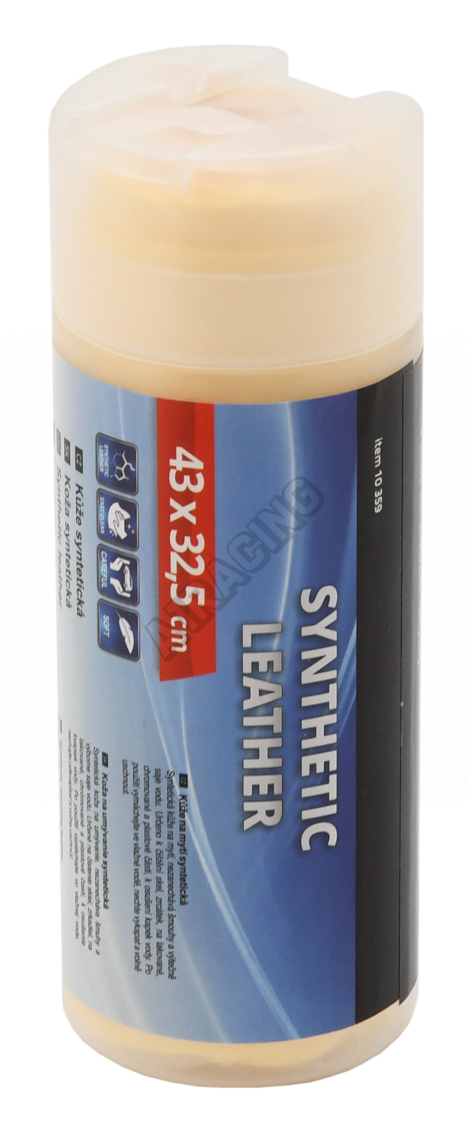 Syntetická kůže na mytí, nezanechává šmouhy a výtečně saje vodu. Určeno k čištění skel, zrcátek, na lakované, chromované a plastové části, k osušení kapek vody. Po použití vymáchejte ve vlažné vodě, nechte vykapat a volně uschnout.