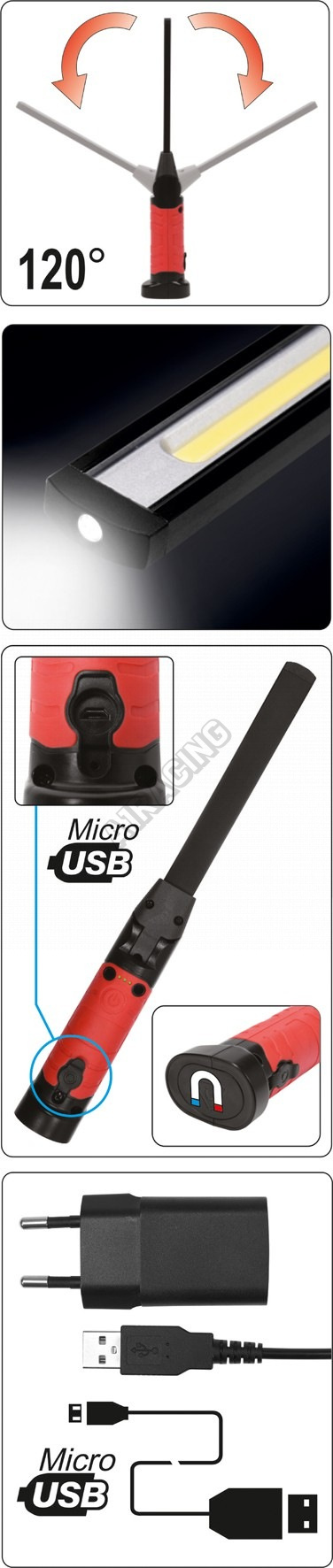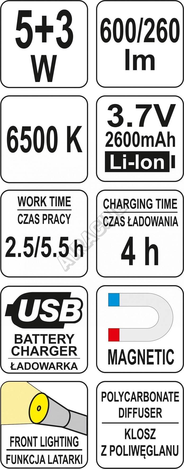 Světlo je opatřeno polykarbonátovou optikou a světelný tok dosahuje hodnot 600/260 lm při barevné teplotě 6500K. Lampa je vybavena silnými magnety ze zadní strany. Může tak stát na rovné podložce, nebo ji lze přichytit na kovovou konstrukci.