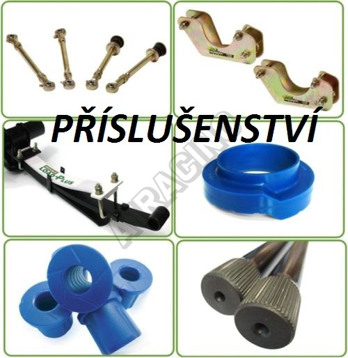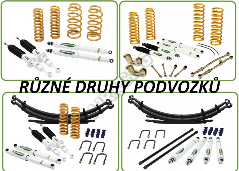 - kompletní podvozkové sety jako jsou tlumiče s pružinama, listovýma perama včetně příslušenství jako jsou stabilizátory, dorazy atd. (zvýšení 0- 40 cm podle modelu)