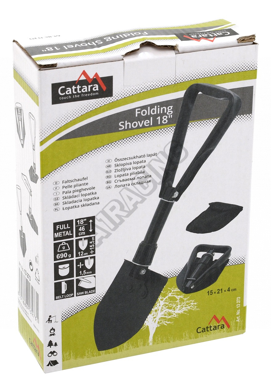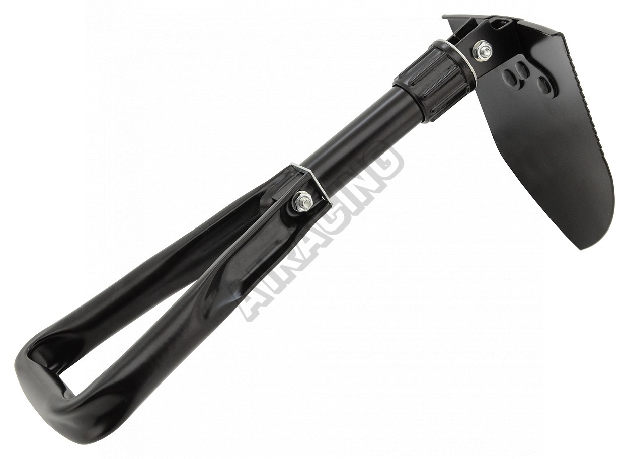 Lopatka má rozměry ve složeném stavu 12 x 19 cm a prodávána je spolu s odolným textilním pouzdrem černé barvy, které lze připevnit za opasek.