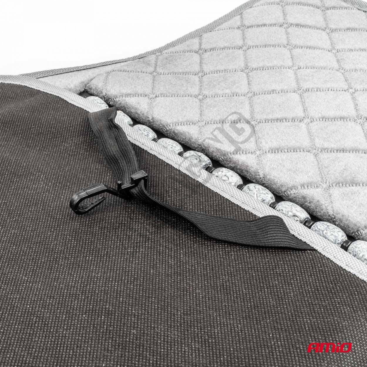Konstrukce z korálků podporuje cirkulaci vzduchu mezi tělem a opěradlem, což zvláště oceníte během delších tras nebo v teplejších dnech. Koberec v neutrální šedé barvě se hodí do většiny interiérů vozidel a dobře ladí jak se světlými, tak i s tmavými čalouněními.